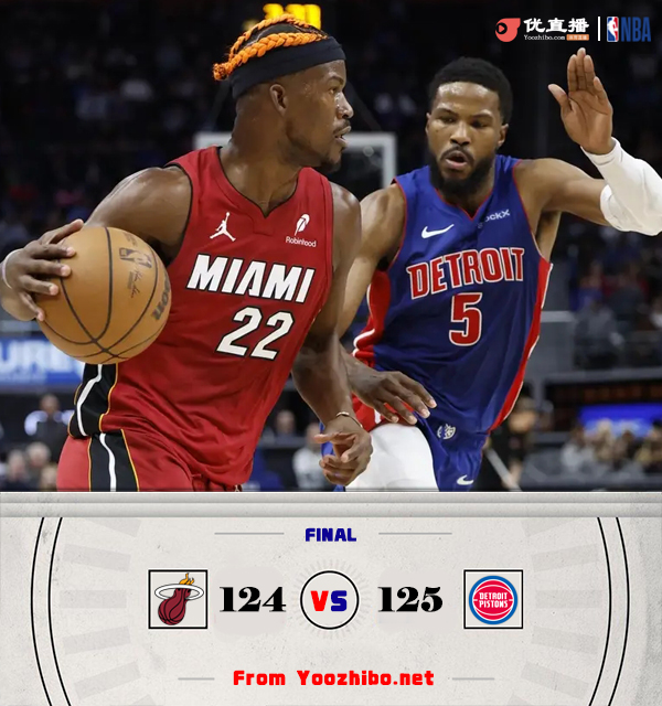 24直播网讯北京时间12月17日讯 NBA常规赛,热火客场挑战活塞。热火4连胜高居东部第五,活塞10胜16负排东部第十一。上半场,活塞率先发力,康宁汉姆得分助攻一肩挑,巴特勒连投带罚带队咬住,次节双方继续对攻,活塞外线开火连中三分,乐福和巴特勒联手带队给出回应,半场战罢热火59-63落后活塞。下半场,活塞占得先机打出9-0确立两位数优势,热火苦苦追赶,比斯利延续火力扩大分差,末节活塞稳扎稳打保持优势,热火突然发力,内外开花迫近比分,希罗三分将比赛拖入加时。加时赛,热火不断冲击内线拿分取得领先,哈达威三分3连击强势回应,关键时刻希罗绝杀不中,热火124-125活塞遗憾告负。