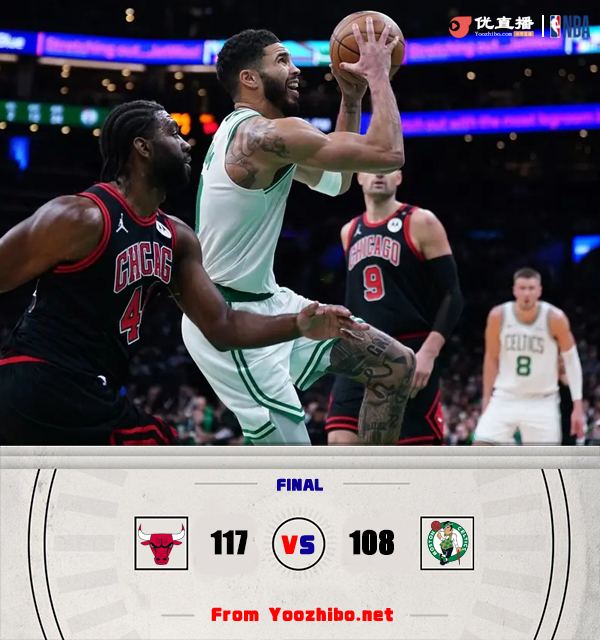 24直播网讯 北京时间12月20日讯 NBA常规赛激战正酣,凯尔特人和公牛两支东部球队正面对话,凯尔特人迎来连胜,目前21胜5负稳居东部第二,公牛同样迎来连胜,12胜15负排在东部第9位。此役一上来双方便陷入缠斗,塔图姆早早开张单节独得12分,拉文里突外投及时回应,首节结束时凯尔特人领先4分,次节回来,双方火力不减拉开对攻,波尔津吉斯肆虐内线予取予求,怀特外线续上火力,拉文手感滚烫连中三分,率队总能给予回应,半场战罢,凯尔特人继续领先3分。易边再战后双方比分继续鏖战,公牛多点开花一度后来居上,但塔图姆再度发力单节12分率队保持优势,凯尔特人带着4分优势进入末节,末节决战,公牛火力全开一举反超,关键时刻凯尔特人进攻滞涩未能逆转,最终公牛117-108力克对手迎来三连胜。