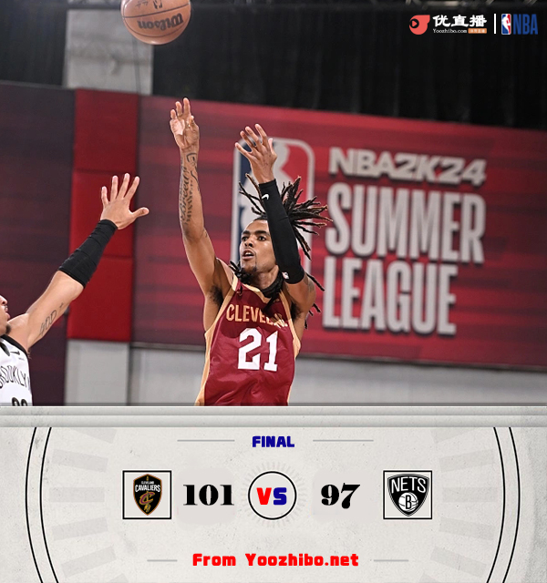 24直播网讯 7月8日 NBA拉斯维加斯夏季联赛开打,骑士首战面对篮网,骑士这边大莫布里领衔出战,篮网阵中,二年级生大卫-杜克和今年的21号秀诺厄-克洛尼在列。比赛开始后双方火热对攻,杜克先声夺人,大莫布里联手贝茨强势回应,末段篮网进攻突然断电,骑士内外开花狂轰19-2攻击波,首节结束时骑士确立11分优势,次节回来,沙里夫-库珀手感滚烫单节独得14分,篮网进攻逐渐复苏,阿尔莫尼-布鲁克斯率队回应,比分没有被进一步拉开,半场战罢,骑士依然领先14分。易边再战后场上形势风云突变,篮网一波17-3抹平分差,克雷格-波特上篮短暂止血,但篮网再次打出9-2小高潮一举反超,三节结束后篮网反超4分,末节决战,贝茨连中三分率队追分,梅里尔打成3+1后骑士再度反超,决胜时刻库珀连续取分,布鲁克斯三分续命无奈篮网追分未果,最终骑士101-97险胜篮网。