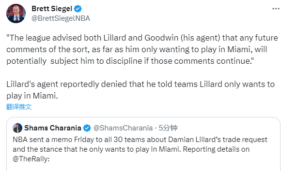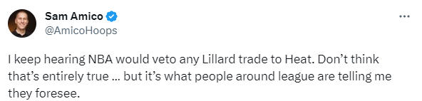 另一名记Sam Amico发推表示:我一直听说 NBA会否决利拉德与热火队的任何交易。别以为这完全是真的,但这就是联盟周围的人告诉我他们所预见的。