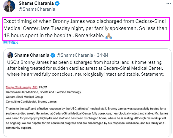 布朗尼在医院住了多久?Shams进一步报道:布朗尼出院的确切时间,据家庭发言人透露,是周二深夜(当地时间)。即布朗尼在医院待了不到48小时。