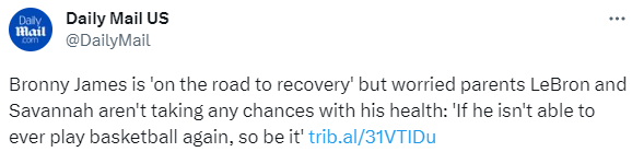 据美媒报道,布朗尼正在康复之路上,詹姆斯和萨瓦娜目前都不关心他的篮球生涯,一位与布朗尼家人关系密切的消息人士透露詹姆斯夫妇目前的态度:如果布朗尼再也不能打篮球,那就顺其自然吧,但这些决定还有很长的路要走。