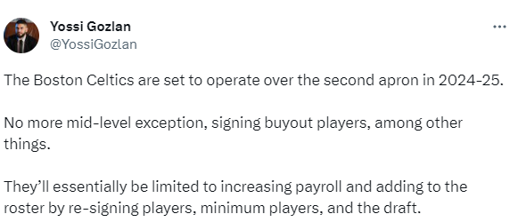 根据联盟最新薪资规则,凯尔特人明年夏天将失去中产特例,也不能签约被买断球员。他们的补强方式被限制在重新签下本队球员、底薪合同和选秀上。