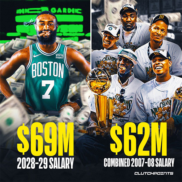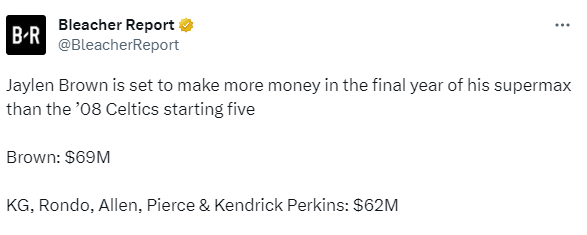 美媒《露天看台》发推:杰伦-布朗在他超级顶薪的最后一年赚的钱将比08年凯尔特人队的首发五人还要多——布朗新合同最后一年薪水超6900万美元,当年加内特、隆多、雷-阿伦、皮尔斯和肯德里克-帕金斯的总薪水是6200万美元。