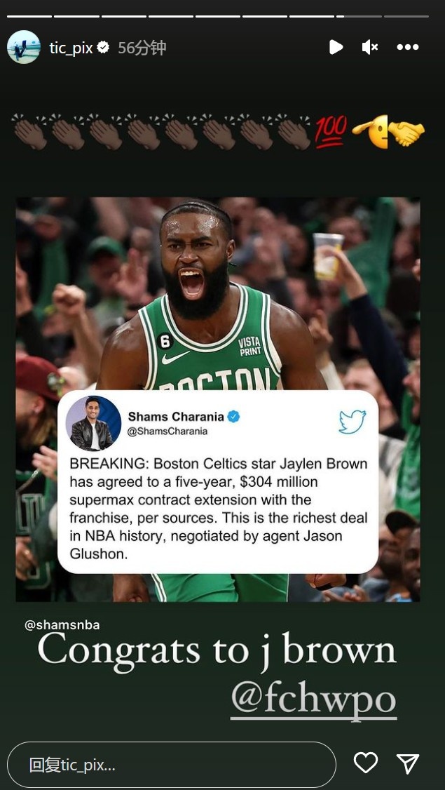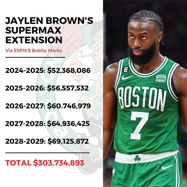 杰伦-布朗和绿军提前续签5年3.04亿美元的NBA史上最大的续约合同,这份合同是全额保障的,含有交易保证金,没有球员选项;布朗续约后,凯尔特人在未来1年内不能交易他。