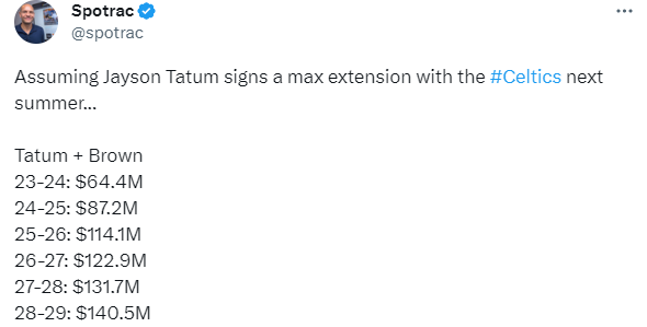 布朗续签5年3.04亿美元大合同,明夏塔图姆有资格和绿军续签5年3.38亿美元的超级顶薪,这将是新的历史最大合同,薪资专家Spotrac列为绿军双探花未来6年的薪水——23-24赛季6440万美元,24-25赛季8720万美元,25-26赛季1.141亿美元,26-27赛季1.229亿美元,27-28赛季1.317亿美元,28-29赛季1.405亿美元。