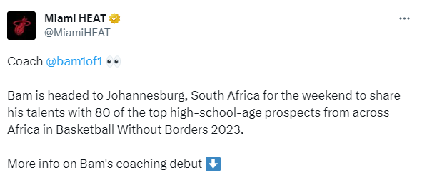 NBA联盟官方也公布了篮球无国界非洲训练营的教练名单,热火中锋巴姆-阿德巴约、骑士后卫达里厄斯-加兰、勇士前锋乔纳森-库明加和魔术后卫杰伦-萨格斯;据悉,国王主教练迈克-布朗也将加入该名单。