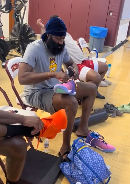 76人记者晒出哈登近日的训练视频,哈登穿着短裤和T恤,戴着头巾、坐在椅子上更换球鞋,之后哈登上场挥汗苦练,从视频中可以看出,哈登借助掩护稳稳命中急停中投,之后连续命中急停三分,招牌双后撤步三分也是一击即中,哈登还加练底角三分以及单腿三分,手感火热,大胡子咧嘴大笑,露出雪白的牙齿。