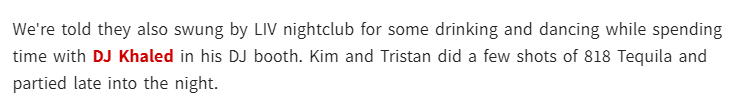 TMZ还爆料,TT和金-卡戴珊还来到夜店喝酒跳舞,他们一起喝了几杯龙舌兰酒,一直狂欢到深夜。