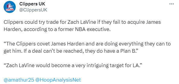 若交易引援哈登失败,快船有意追求拉文;值得一提的是,今夏拉文又陷入交易流言之中,尼克斯曾向公牛问价拉文,由于公牛要价很高,这件事也就没有下文了;美记曾报道公牛就拉文交易接触过开拓者和76人。