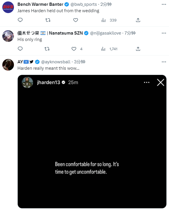 恩比德现任队友和前队友前来捧场,合影中没有哈登引热议,有球迷问哈登在哪儿,有球迷直言哈登拒绝参加婚礼;还有球迷晒出哈登此前“舒服的太久,是时候跳出舒适圈了”的动态,写道:哈登真的是这个意思哇;另外还有球迷调侃恩比德至少获得一枚戒指了。