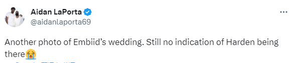 76人记者表示,另一张恩比德的婚礼照片,仍然没有迹象表明哈登在那里。
