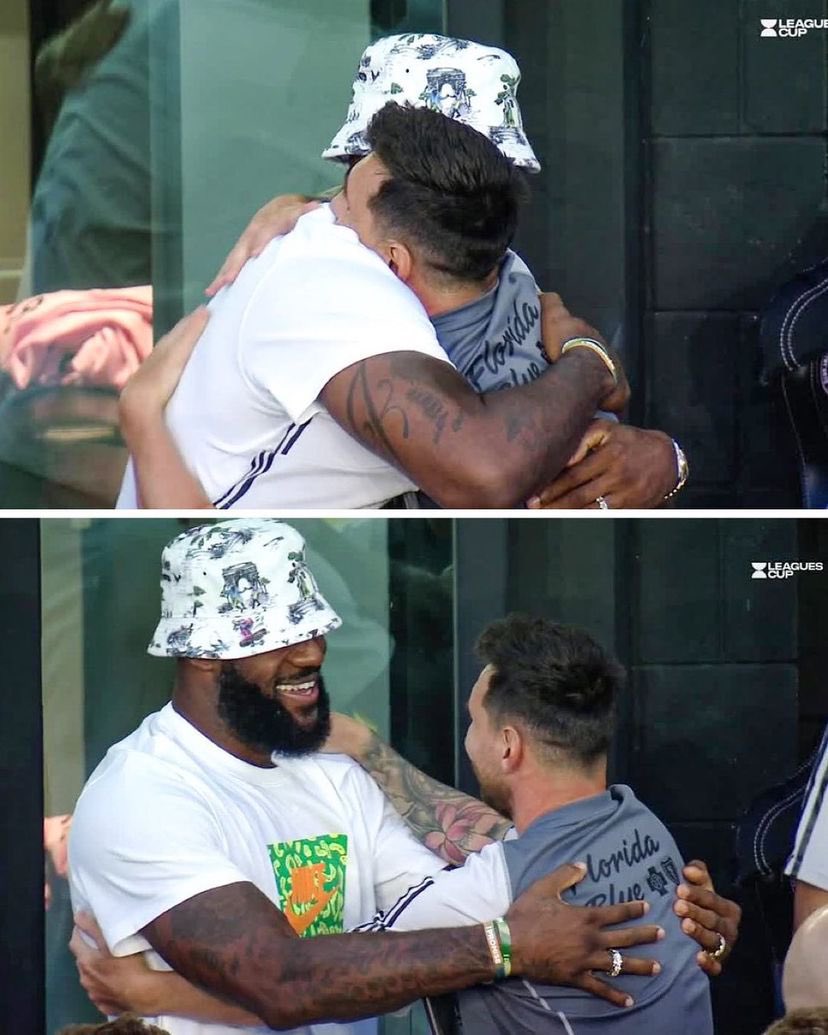 38岁的詹姆斯身穿短裤和白色T恤、带着一顶小白帽来到现场;在梅西迎来迈阿密国际首秀赛前,詹姆斯和梅西深情亲密拥抱,两人抱在一起很久,而且拥抱了两次,两人深情拥抱开心热聊一幕引美媒刷屏转发,直呼国王和goat。