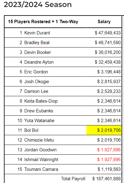 太阳队23-24赛季总薪水1.8746亿美元,加上奢侈税总开支超过2.4亿美元;太阳新赛季的冲冠核心阵容已经确定下来,比尔、戈登等新援辅佐杜兰特、布克冲冠。