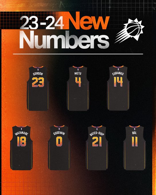 太阳官方正式公布多位新援的球衣号码——埃里克-戈登23号;奇梅齐耶-梅图4号;德鲁-尤班克斯14号;渡边雄太18号;乔丹-古德温0号;凯塔-贝茨-迪奥普21号;波尔-波尔11号。