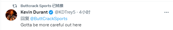 另外一个著名的创作假新闻的假账号Buttcrack Sports则是报道了追梦被骗这个消息,还引用了此前杜兰特对这些假账号的看法:这些假冒账号一定会让你们所有人都很难受。
