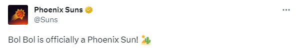 太阳官宣签约波尔-波尔,太阳总经理詹姆斯-琼斯声明:波尔能为我们的前锋和中锋位置带来了独特的技能和能力,这进一步增强了我们的深度和多才多艺。他的持续成长和发展将帮助我们成为一支更加完整的团队。