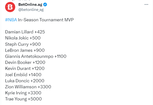 1、利拉德+425;2、约基奇+500;3、库里和詹姆斯+900并列;4、字母哥+1100;5、布克和杜兰特+1200;6、恩比德+1400;7、东契奇+2000;8、锡安和欧文+3300并列;9、特雷-杨+5000