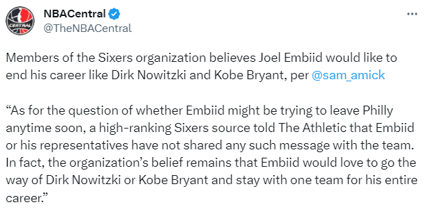 现在恩比德的目标是只有总冠军,未来他会申请离队吗?名记Sam Amick表示76人管理层相信恩比德会像诺维斯基和科比那样终老在费城,他表示:至于恩比德是否可能很快申请离队的问题,一位76人队的高层透露,恩比德或他的经纪人尚未与球队分享任何此类信息。事实上,76人仍然相信恩比德愿意走德克-诺维茨基或科比-布莱恩特的道路,并在整个职业生涯中留在一支球队。