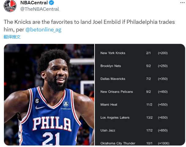 若恩比德离开费城,他的下家赔率具体情况——1、尼克斯1赔2(+200);2、篮网2赔5(+250);3、独行侠2赔7(+350);4、鹈鹕2赔9(+450);5、热火2赔11(+550);6、湖人2赔13(+650);7、爵士2赔17(+850)和雷霆1赔10(+1000)。
