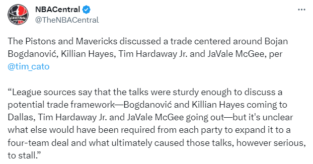 目前该笔交易已经存在了一个潜在的框架,具体为:,但不清楚双方要如何操作才能使得此次交易变为四方交易,使得谈判陷入了僵局,具体原因不知晓。而独行侠对于是否交易2027年的首轮签的态度十分谨慎,由于他们欠了多队的未来首轮签,所以使得这枚首轮签变得不受保护。