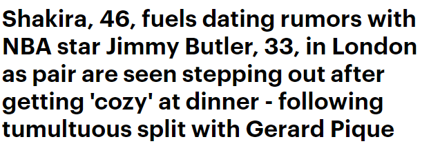 巴特勒的新恋情曝光,正在和比自己大13岁的拉丁天后夏奇拉约会,目前巴特勒已经飞抵中国,开启自己的中国行;22-23赛季,巴特勒出战64场常规赛,场均拿到22.9分5.9篮板5.3助攻,季后赛场均26.9分6.5篮板5.9助攻,带领热火一路黑八杀进总决赛,可惜不敌掘金无缘总冠军。