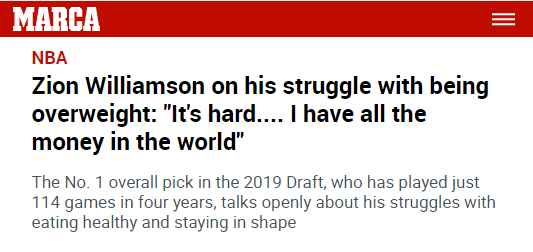 谈到控制体重的话题,锡安回应:这很难,伙计!我才20、22岁,就拥有了世界上所有的钱——嗯,我的钱多得就像拥有了世界上所有的钱一样。控制体重真的很难。