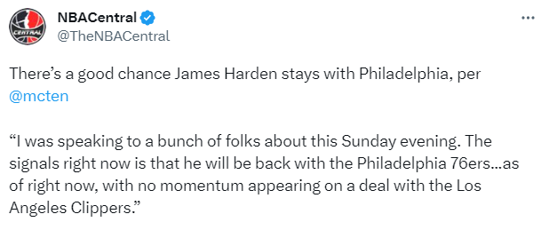 曝哈登将回归76人: 申请离队却无交易市场 恩比德希望他留下来