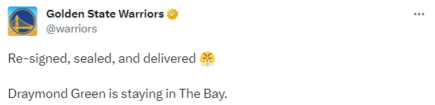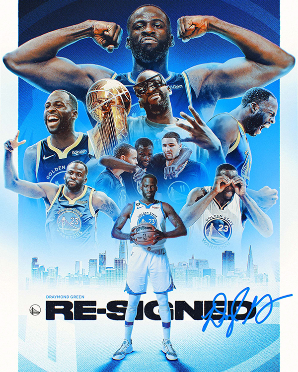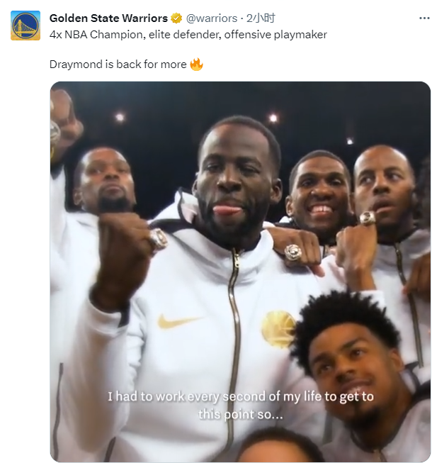 勇士官宣和格林重新签约,官推晒照并且写道:续约,盖章生效,德拉蒙德-格林将留在湾区;勇士官方还晒出格林集锦,盛赞格林是4届总冠军得主、精英防守者和进攻组织核心。