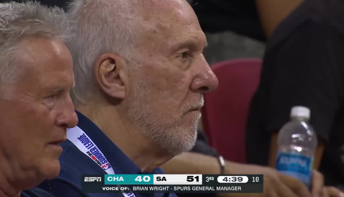 下半场,文班亚马第三节在防守中惨遭凯-琼斯隔扣,身体失去平衡险些摔倒,看到文班惨遭隔扣,马刺主帅波波维奇一脸不开心;文班亚马还被米勒拜佛晃得找不到方向,