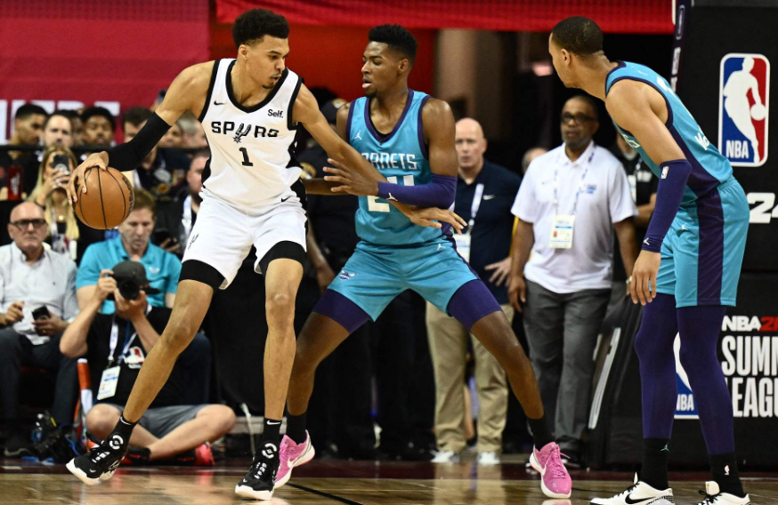 比赛正式开打,文班亚马开场前3次投篮都未能命中,期间文班亚马单挑榜眼米勒,杀到禁区起跳扣篮却弹框而出;随后文班亚马禁区成功防守对手,运球一条龙并且妙传助攻队友,紧接着文班亚马接球后遭遇包夹,仍打进不讲理2+1,打进个人首球;第一节打了4分钟后他下场休息,坐在替补席观战。