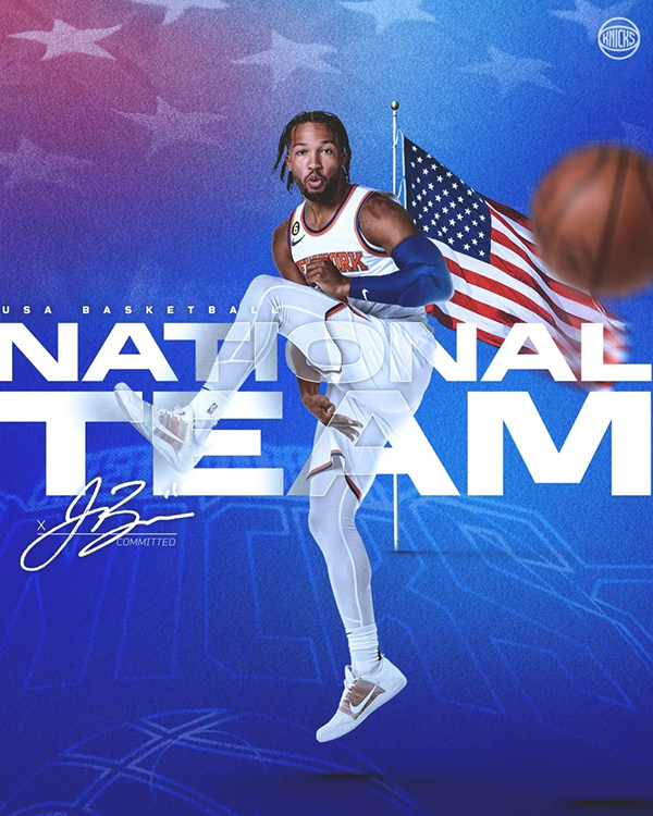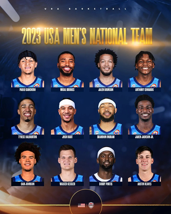 美国男篮12人大名单正式出炉——爱德华兹10号(森林狼队)、布伦森(尼克斯队)、里夫斯15号(湖人队)、米卡尔·布里奇斯5号(篮网队)、哈利伯顿4号(步行者队)、波蒂斯(雄鹿队)、英格拉姆7号(鹈鹕队)、小贾伦·杰克逊(灰熊队)、卡梅隆·约翰逊6号(篮网队)、凯斯勒(爵士队),班凯罗8号(魔术队),哈特(尼克斯队)。