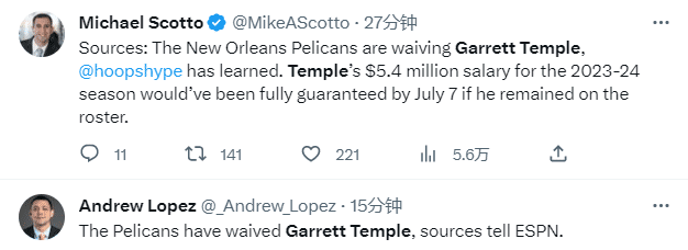 来源:24直播网07-06 13:0424直播网讯07月06日,据名记Michael Scotto报道,鹈鹕记者确认,鹈鹕已经正式裁掉了老将加勒特-坦普尔,后者新赛季540万美元的薪水将在7月8日变成完全保障合同,鹈鹕裁员能够省下一笔奢侈税,不过鹈鹕现有13人名单的薪水仍超过奢侈税线。