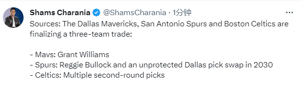 三方交易框架——独行侠获得格威+两次轮,马刺获得布洛克和2023年首轮互换,绿军获得多个次轮签!