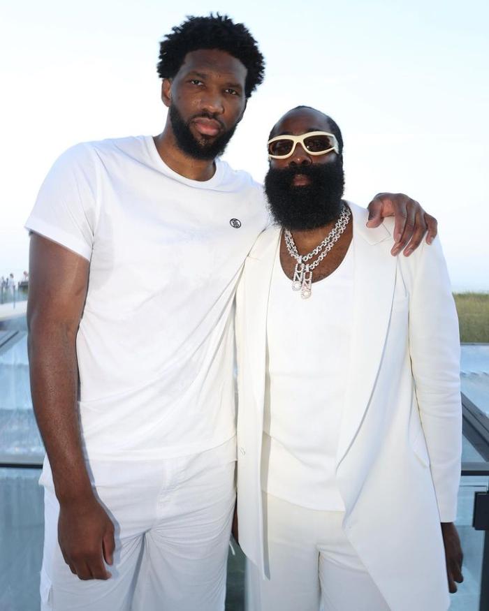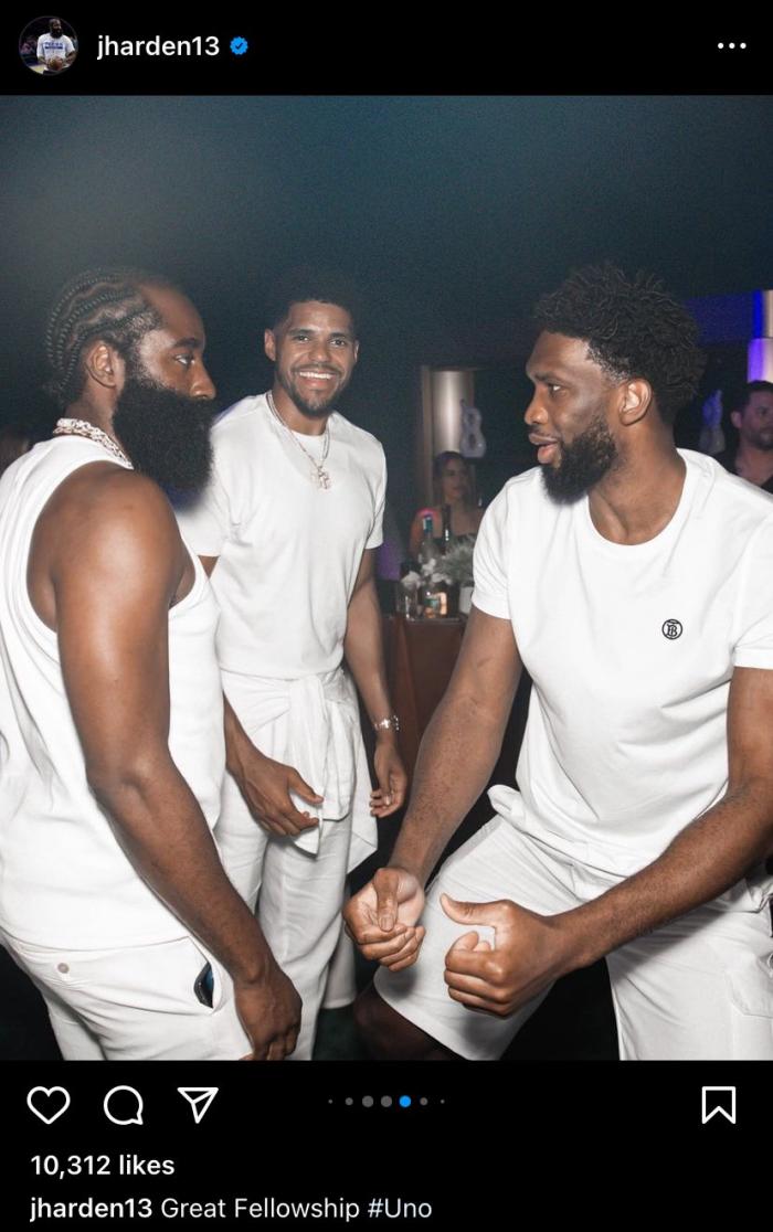 在派对上,哈登、恩比德和PJ-塔克在舞台上尽情热舞,现场氛围嗨翻天;哈登本人晒出与恩比德、哈里斯开心闲聊等多张合影,哈登扬天拉拽项链太开心了。