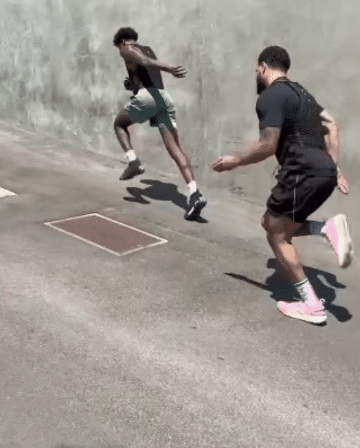 范弗利特和火箭新星杰伦-格林一起在洛杉矶进行训练,他们一起跑步爬坡以及练习脚步动作,范乔丹还负重进行训练,他们两人早已练得浑身是汗;值得一提的是,杰伦-格林明显变得更壮了。