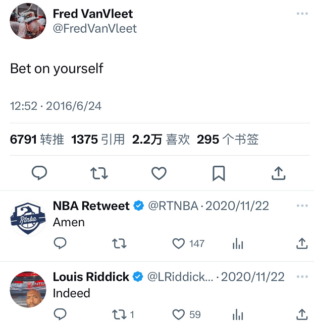 在签约火箭之后,范弗利特转发了自己在7年前参选NBA最终落选的动态,当时他在社交媒体上表示:“把赌注押在自己身上(bet on yourself)。”