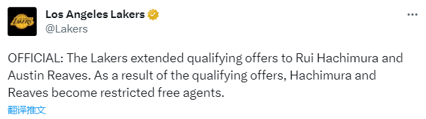 湖人官方正式宣布,球队已经为八村垒和里夫斯提供资质报价,二者成为受限自由球员;根据受限制自由球员规则,湖人可以匹配其他任何球队对里夫斯和八村垒开出的合同报价,这是湖人决定和他们续约的第一步。
