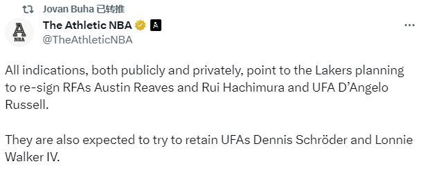 Jovan Buha报道,湖人计划和拉塞尔续约,还想留下施罗德和沃克;在22-23赛季期间,湖人在交易截止日前引援拉塞尔,后者重返洛杉矶,常规赛为湖人出战17场比赛,场均拿到17.4分6.1助攻2.9篮板,季后赛出战16场,场均贡献13.3分4.6助攻2.9篮板,西决对阵掘金,拉塞尔的表现十分糟糕,甚至被哈姆贬为替补。