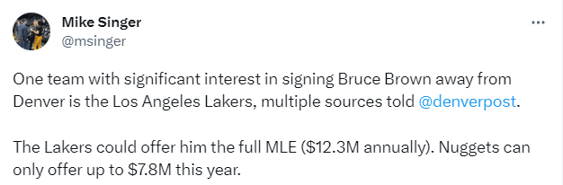 据掘金记者Mike Singer报道,湖人有意引援布鲁斯-布朗,湖人可以为他提供每年1230万美元的全额中产合同,掘金今年只能给他780万美元。
