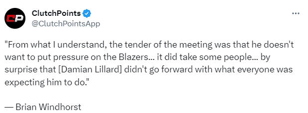 Brian Windhorst谈到利拉德和开拓者会面商讨未来,表示:据我了解,这次会议的温和之处在于他不想给开拓者队施加压力,这确实让一些人感到惊讶的是,利拉德没有按照大家的意愿申请交易。