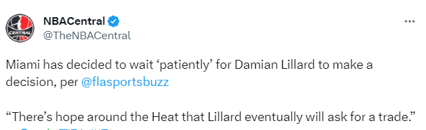 据热火记者Barry Jackson报道,热火决定耐心等待利拉德做决定,热火队希望利拉德最终会申请交易,因为热火认为利拉德是一个值得等待的球员;该记者还表示热火希望和文森特续约,无论球队是否能够得到利拉德,热火总裁莱利将和文森特会面。