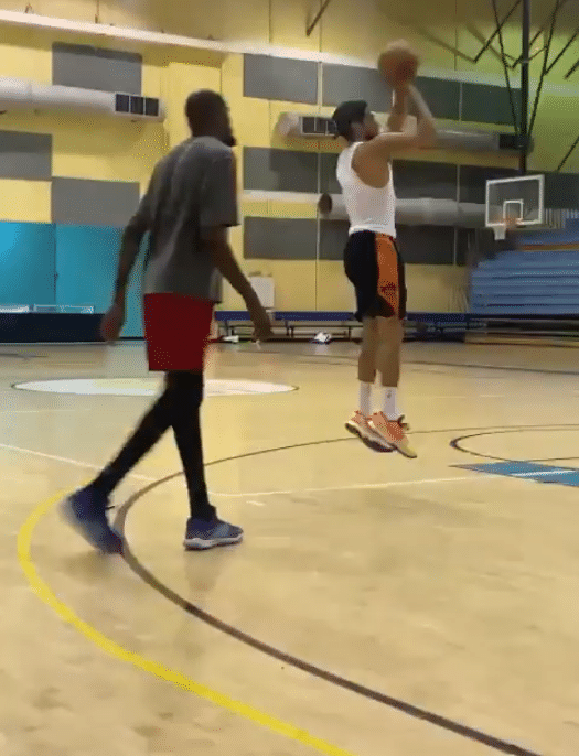 杜兰特身穿灰色T恤和红色短裤,布克反戴棒球帽,身穿短裤和白色小背心,他们两人苦练中投, 从曝光的视频可以看出,他们的中投几乎是百发百中。
