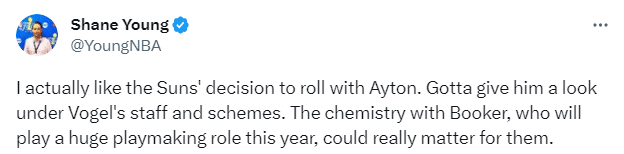 Shane Young谈到了太阳可能留下艾顿的决定,表示:实际上我很喜欢太阳队很有可能留下艾顿的决定,必须让他在沃格尔的手下打球看看效果如何。(艾顿和布克一起打了很多年球),他与布克有化学反应。布克在下赛季必须承担起更多,他会更多地扮演组织角色,对太阳队来说可能真的很重要。