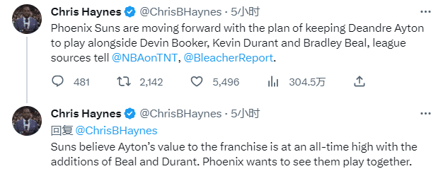名记Chris Haynes报道,太阳队正在推进保留艾顿的计划,以便让他与布克、杜兰特和比尔一起打球;太阳队相信,随着比尔和杜兰特的加盟,艾顿对球队的价值达到了前所未有的高度,球队想看他们一起打球。