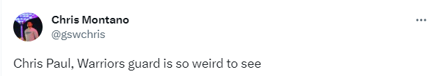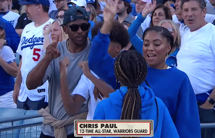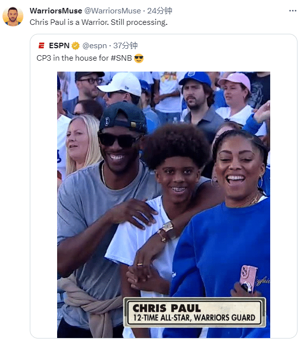 38岁的保罗反戴棒球帽、戴着墨镜观看道奇队的比赛,咧嘴大笑十分开心;现场镜头抓拍到保罗,在简介中写着“12次全明星、勇士后卫”;保罗被贴上勇士后卫的标签引热议,名记Chris Montano发推表示:克里斯-保罗,勇士后卫,看起来太奇怪了。