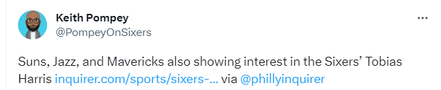 据报道,太阳、爵士、独行侠、骑士、步行者和活塞都给76人打电话询价哈里斯的可用性,据消息人士表示,太阳队希望哈里斯与杜兰特、布克和比尔并肩作战,他们希望在6月30日自由球员市场开始之前得到他;可太阳需要送走艾顿,76人对艾顿没有兴趣,76人队也对太阳队提供的任何球员都不感兴趣。