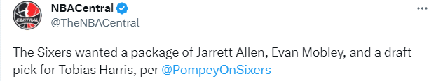 76人在选秀前几天就哈里斯的交易向骑士要价双塔(贾勒特-阿伦、埃文-莫布里)和一个选秀权。而骑士是不可能考虑这样一笔交易的,76人知道这一点。