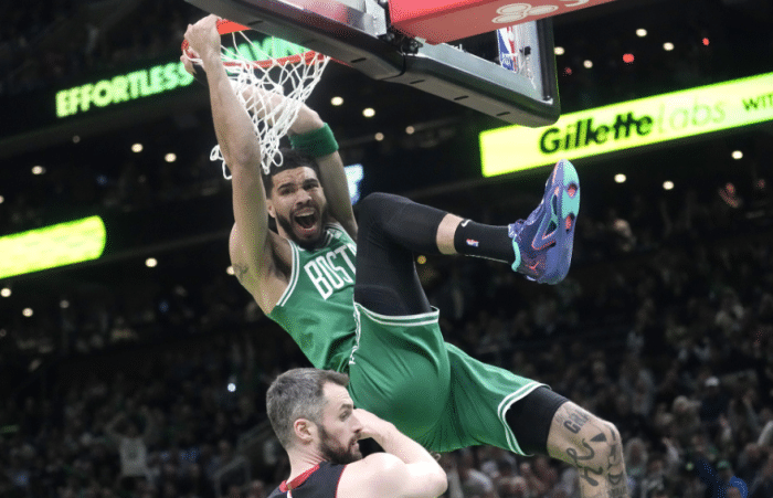 东决G5生死战,凯尔特人第一节火力全开,23-7梦幻开局,单节轰进7记三分并且首节35-20领先热火15分,塔图姆单节8中5高效轰下12分,两次杀到禁区暴扣点燃球馆,不过因暴扣后挥拳抱怨裁判吃T;另外怀特首节贡献11分,塔图姆和怀特单节23分超热火全队。