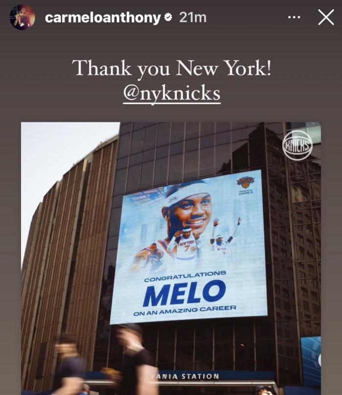 不久前,尼克斯官方再次向安东尼致敬,晒出众人祝福安东尼的视频,配文写道:一日尼克斯,终生都是尼克斯人;官推还晒出安东尼尼克斯生涯首秀集锦,2011年2月23日,尼克斯主场对阵雄鹿,安东尼身穿尼克斯7号战袍出战,开场补篮拿到尼克斯生涯首分,关键时刻杀到禁区暴扣,全场拿到27分10篮板并且带队赢球。